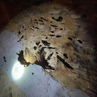 There are no words to describe the plumbing. Masking tape (not even duct tape!), no pvc primer on some pipes, some pipes with no pvc cement, and negative slope drain pipes all describe what we found in a nutshell. Oh…and did I mention, there are no shutoff valves anywhere in the house other than under the sinks and the main water line from the well!!! Makes doing plumbing work inconvenient if you want to use the bathroom - not to mention if a line to the tub ever broke, the whole house would be without water until it got fixed! 🤦♀️ Electric without the proper junction boxes or wire covers and wires stuffed in random pieces of fiberglass insulation is just the start of the electrical issues. A wall that was installed to hide the pipes and adhere cabinets to, was installed in a manner that it became the support wall for the main beams of the house holding up the second floor, leaving a 1/4” to 1” gap between the real support wall - the exterior wall of the log home - and three of the ceiling support beams. Additionally that fake wall placed excessive weight on the flooring causing the wood to bow near the exterior wall. That is a whole lot of weight to make a whole wall of 2x4 flooring to bend within 6” of the end on concrete foundation support. Due to the obvious leaks and pipe bursts, water of course made its way where it should not have ever made its way. The wet and damp wood made for a perfect home for carpenter ants. We don’t know the full scale of that damage quite yet…the carpenter ants is what made that puzzle design on the floor. The dark areas are holes to the crawl space.